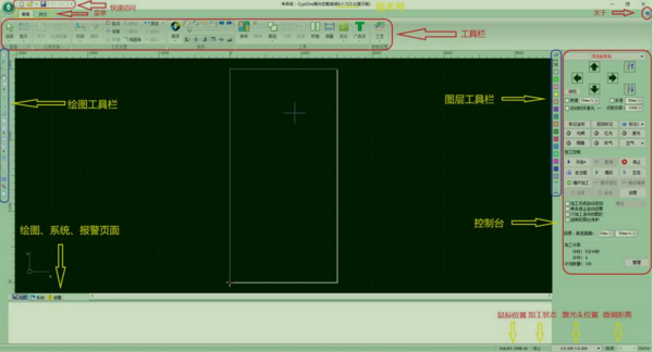 界面最底部是状态栏,根据不同的操作显示不同的提示信息。状态栏的左侧是已绘制的加工图形的基本信息,状态栏的右侧包括几个常用信息,包括鼠标所在位置、加工状态、激光头所在位置。后面一个微调距离参数,用于使用方向键快速移动图形,最后显示的是控制卡的型号。