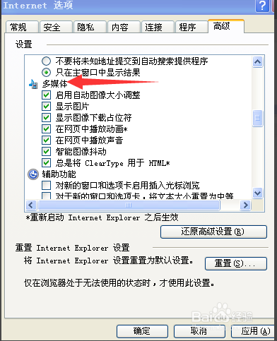 2工具—Internet选项—高级—将“多媒体”里的网页动画、声音、视频都勾上