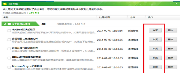 2.可能你在使用插件清理过程中把Flash插件给删除了,在恢复区找到Flash插件,然后点击恢复。如果没有的话,其它的不要乱恢复