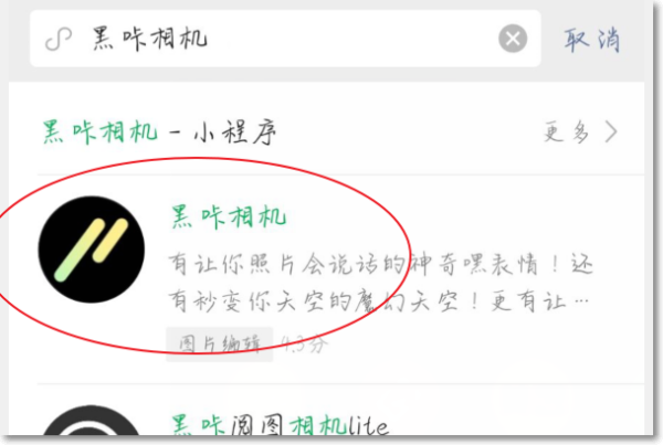 2、然后搜索“黑咔相机”小程序。如图所示: