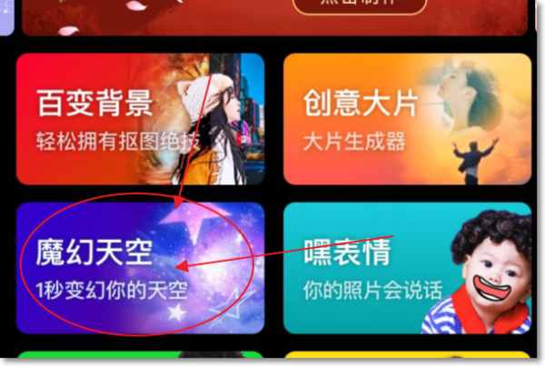 3、接着进入“黑咔相机”小程序后,点击“魔幻天空”。如图所示: