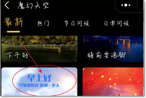 4、接下来从魔幻天空特效页面选择一个你喜欢的特效,然后从手机相册里选择自己需要添加变化天空特效的素材。这里以“早上好”为例。如图所示:
