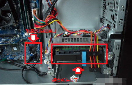 1、将准备好的台式机主机外壳拆下,将之前取下的硬盘用硬盘线连接到主板,并插上电源分出来的硬盘电源线。