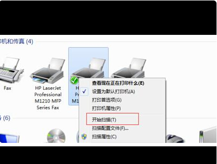 2、找到打印机图标,然后右击并点击“开始扫描”。