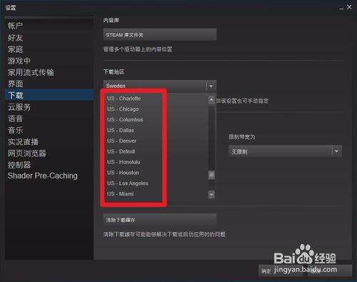 在Steam界面的“查看”选项选择“设置”然后点击“下载分类”,可以设置下载区,国内可以选择美国下载区和国内下载区啥的,一般选择美国下载区下载速度很快,国内也可以,只要你网络给力,在无干扰的前提下,Steam的下载服务器是很好的,基本是满速的,跟迅雷差不多。