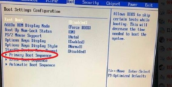 3、使用方向键选中BOOT设置项中的Primary Bot Sequence项按回车键。