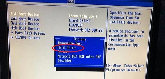 4、选择1St Boot Device项回车确定,通过上下方向键选中Hard Drive选项回车确认。