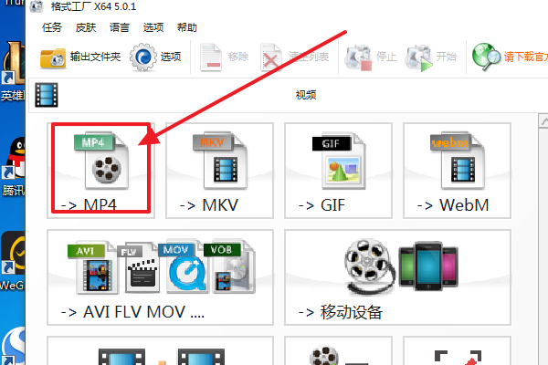1、当然,也可以利用格式工厂实现视频格式的转换操作。在此直接将视频拖动到程序窗口中,或者直接选择一种格式,如图所示:
