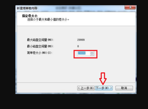 7、然后在出现的界面输入要创建的卷的大小,点击“下一步”。