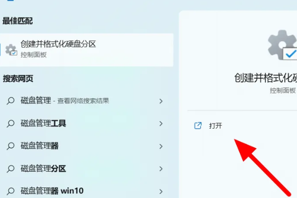 1、在搜索中搜索磁盘管理,点击【打开】。