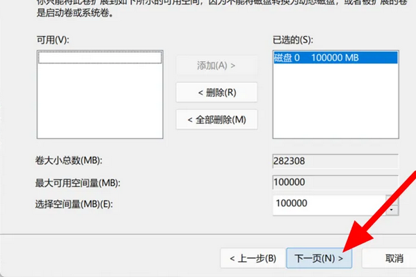 6、在选择磁盘界面,设置空间,点击【下一步】。