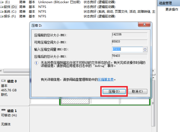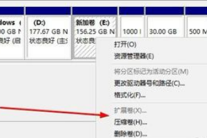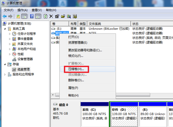 3、在需要挤压空间的磁盘上进行右键---压缩券,先把可分配空间的总和给计算出来。