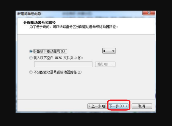 8、接受默认驱动器号或选择其他驱动器号以标识分区,点击“下一步”。