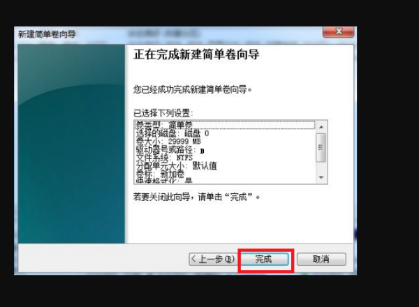 10、最后点击“完成”即可。完成以上设置后,即可把D盘分盘。