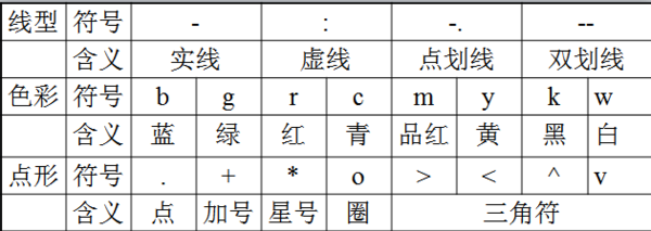 x,y是向量,分别表示点集的横坐标和纵坐标,s表示线型、颜色、点形