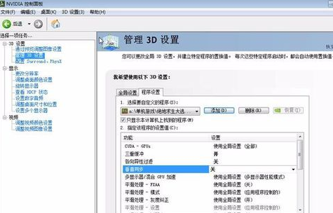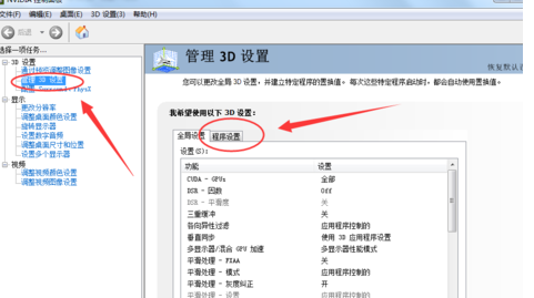 进入到显卡控制面板以后,点击“管理3D设置”,然后再点击“程序设置”,如下图所示。