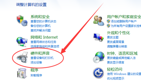 首先打开控制面板,进入控制面板以后“打开硬件和声音”如下图所示。