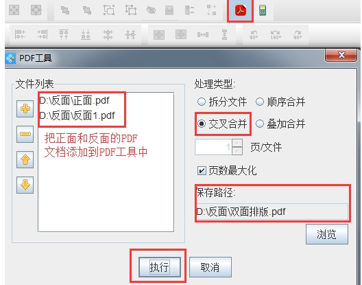 4.得到标签正面和反面的PDF文档之后,使用中琅领跑条码打印软件中的“PDF交叉合并”功能将两个PDF文档进行奇偶页交叉合并。在软件顶部工具栏中点击“PDF工具”,在弹出的窗口中,把正面的PDF文档和反面的PDF文档添加到文件列表中,处理类型选择“交叉合并”,根据需要勾选“页数最大化”,页数最大化勾选上的话,最后生成的PDF文档就会以页数最多的PDF文档的页数为准,进行生成。选择好“保存路径”,点击“执行”按钮,就可以生成双面排版的PDF文档了。