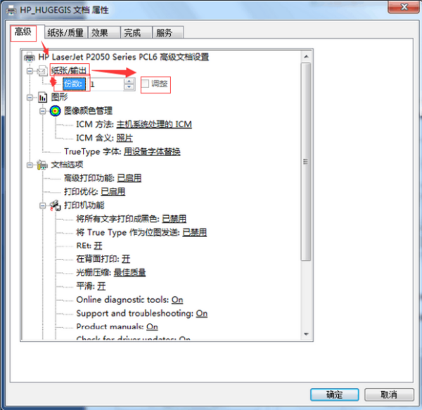 4、选择上方“高级”-打印机功能部分的“在背面打印”设置为开