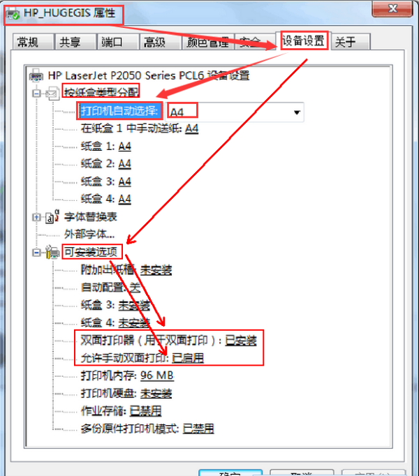 安装打印机驱动程序后。打印机设置自动双面打印,在“打印机设置”属性页上进行设置即可: