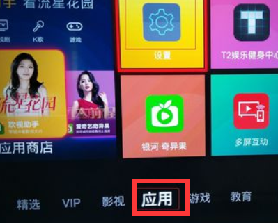 2、其次,在电视屏幕的弹出界面中,选择[应用]-[设置],如下图所示,然后进入下一步。