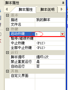 3)在编辑器右边的属性里修改启动热键!~在(如图)的地方输入1