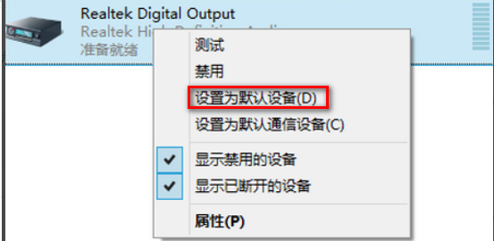4、最后,下面有Realtek数字输出设备,这是HDMI音频输出, 右键单击此项并选择“设置为默认设备”,见下图。设置后,声音将自动切换到HDMI输出, 电视就有声音了。这样,问题就解决了。