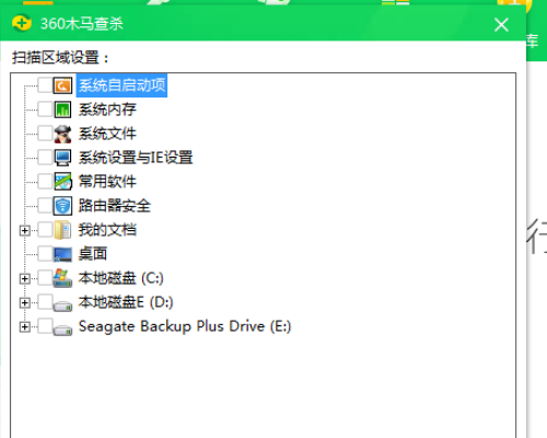 3、点击“按位置查杀页面”,弹出扫描区域的选择页面,在页面上勾选U盘,然后点击开始扫描,扫描结束后,清除木马病毒即可。