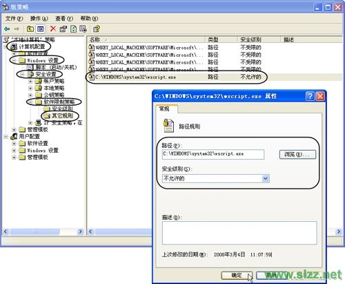 第三步:在右侧窗格空白处右击,在菜单中选择“新建路径规则”项。在弹出的窗口中,点击“路径”后的“浏览”按钮,选择C:\Windows\System32文件夹下的wscript.exe文件,并将“安全级别”设置为“不允许的”(见图)