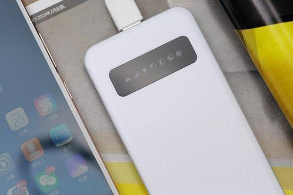 华为随身WiFi Plus非常小巧,机身尺寸为115×72×23mm,重量约有235g(含电池),因此即使放入口袋携带也异常轻松。华为WiFi Plus侧边加入了镀铬饰条装饰,一整圈围绕后让产品多了些时尚感。另外在一侧边还有4颗LED点亮指示灯,每颗灯泡代表电量25%。