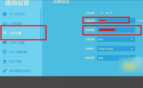 6、点击左侧菜单栏的无线设置,右边只需填写自己的名称跟密码。点击保存。