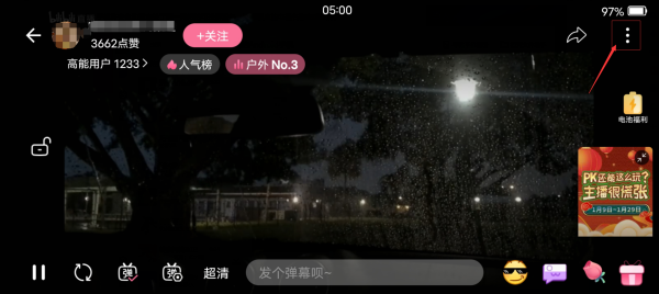 2、打开哔哩哔哩APP,播放想要投屏的直播,在全屏观看的模式下,点击右上角的三个点。