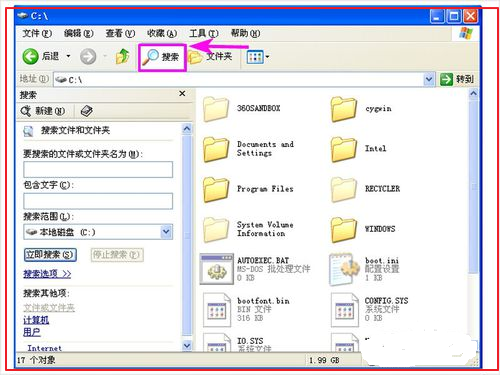 4、在C盘中找到搜索并且直接点页面上的放大镜搜索,如图。