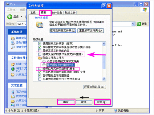 3、取消勾选“隐藏受保护的操作系统文件”,勾选“显示所有文件和文件夹”并且取消勾选“隐藏已知文件类型的扩展名”,然后点击应用和确定。