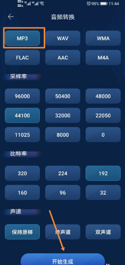 3、在系统弹出来的“音频转换”界面选择转换为的格式“MP3”,然后点击界面底部的“开始生成”按钮。