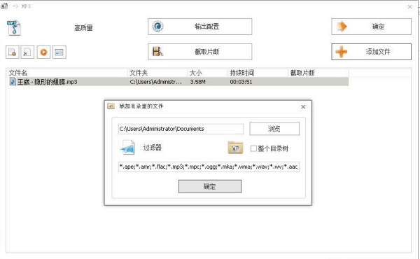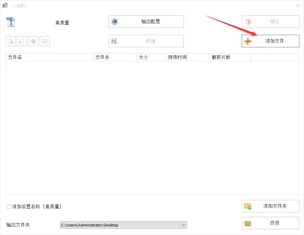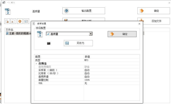 6.在任务处理列表上面,点击“输出配置”按钮可以对音频文件的输出文件进行一些配置处理