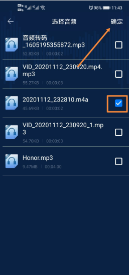 2、在系统弹出来的“选择音频”界面中选择需要转换为MP3格式的音频,然后点击界面右上角的“确定”按钮。