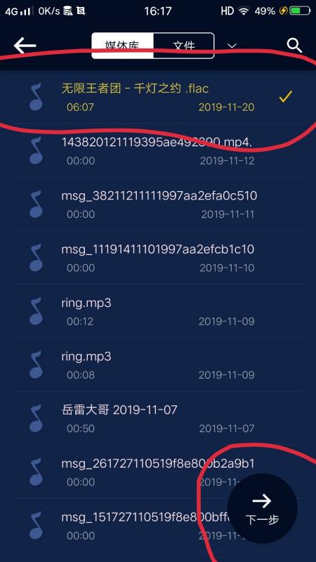 第四步,这里可以找到手机里面所有的音乐或者音频文件,选择在需要进行转换格式的flac音频文件,点击下一步。