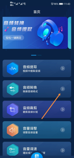 1、以华为荣耀play4 5G版为例,打开MP3音频转换器,在“首页”中点击“音频转换”选项右侧的“>”图标。