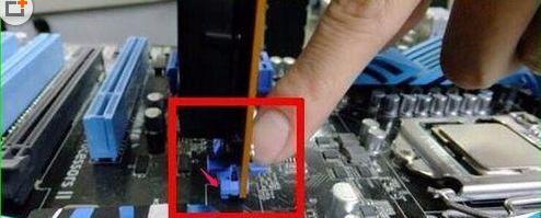 6、安装内存。安装内存时,先对准插槽,用力向下压直到内存扣具自动恢复原状,如图所示;