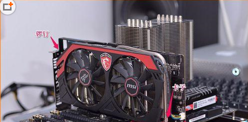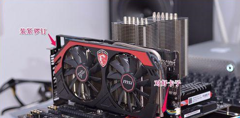 7、安装显卡。先对准卡子及显卡和显卡插槽上的缺口,用力向下压,安装好锣钉和电源线;