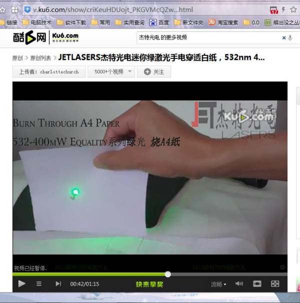 而400mW绿光的灼烧能力,聚焦直接瞬间烧穿A4纸(而点火柴不用调焦,碰上光束就着):