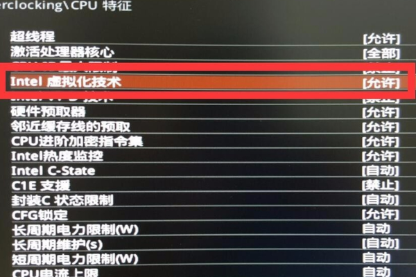 7、进入CPU特征后找到“Intel虚拟化技术”,按回车,选择“允许”。保存后重启,虚拟就开启了。