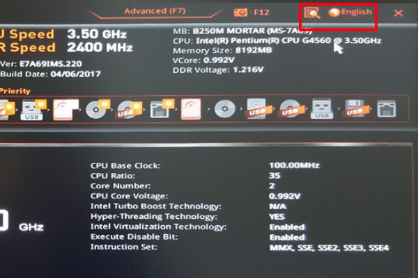 2、进入“bios”界面找到右上角的语言(english)。