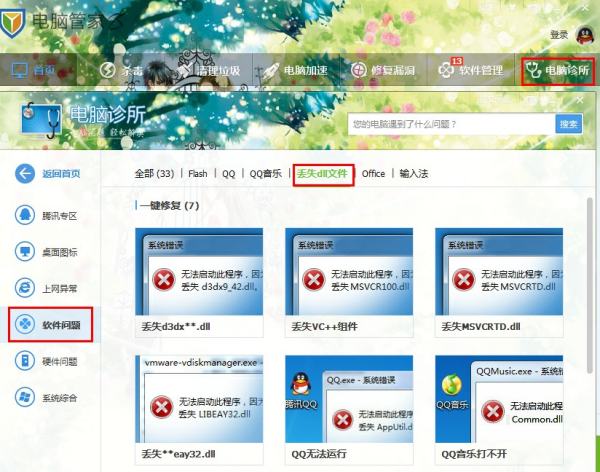3、还可以用腾讯电脑管家修复下,打开电脑管家——电脑诊所——软件问题——【缺少dll文件】,修复。