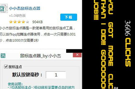 小小杰鼠标连点器是一款非常简单好用的鼠标连点器,小小杰鼠标连点器只有一个复选框和一个文本框,界面非常简洁,点击速度超快,绿色无广告。