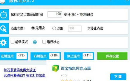 简单百宝箱鼠标连点器所有游戏通用,最快速度每秒点1000次,而且永久免费,绿色免安装。
