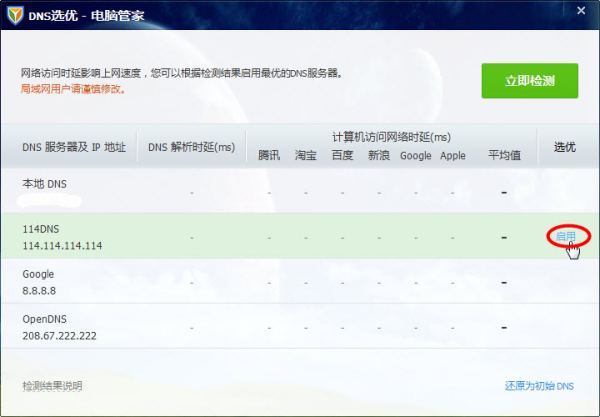 在排除网卡驱动程序因素后,你可尝试更改DNS服务器地址看看。你可点击电脑管家工具箱中的DNS优选,可以不必进行检测,而直接选择某个DNS服务器地址,一般是选择第二个114.114.114.114或第三个8.8.8.8,选择右侧的启用按钮。当然你得保证如IP地址、网关、子网掩码等的设置并没有错误或改变过。