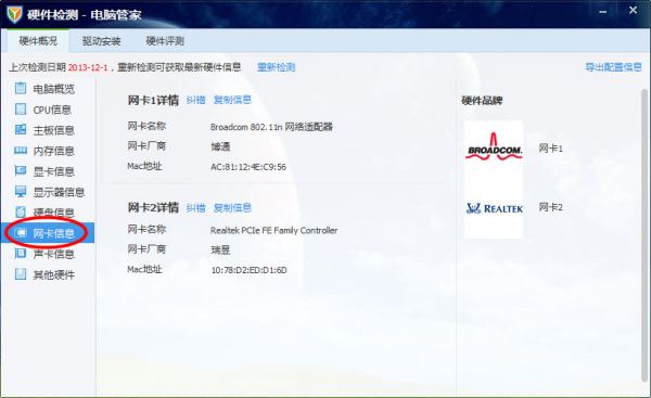如果仍旧不行,可点击腾讯电脑管家右下角的工具箱,点击硬件检测,在网卡信息中看看网卡型号是什么,然后在其它可上网的计算机上下载相匹配的驱动程序再安装看看。