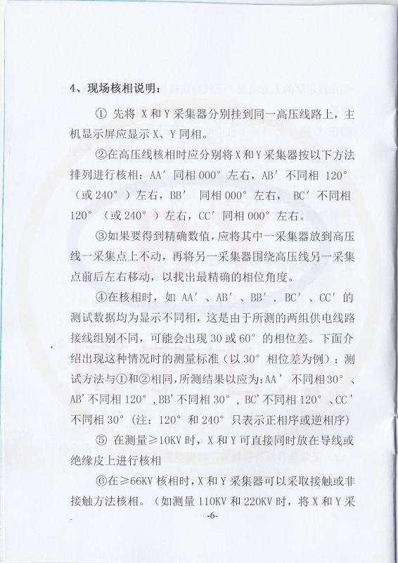 ②在高压线核相时应分别将X和Y釆集器按以下方法排列进行核相:AA’同相000°左右,AB’不同相120°